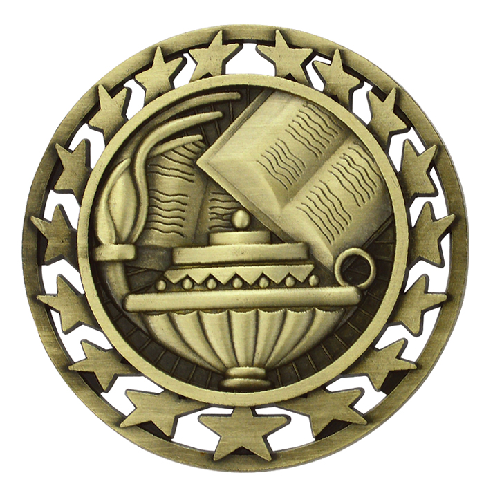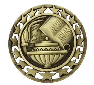 A big, 2.5" medal at a great price. This terrific star design is available in gold in stock for immediate shipment in all 11 titles. The torch and lamp can be shipped in silver and bronze within 24 hours as well. For other title and color combinations, we need an additional 5 days. Combine titles for quantity discounts.
