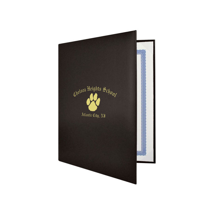 These padded diploma covers feature a lightly textured leatherette surface and your logo or wording foil stamped on the cover. This folder holds one 6" x 8" document vertically or horizontally. Minimum order is 50. Imprint size is 3" x 5". A $50 die charge applies to first order. Colors may be combined for quantity discounts. Shipped within 6 business days -- First order takes one extra week. If using a custom logo please remember to upload your artwork at www.jonesawards.com and reference your order number.
