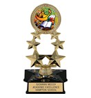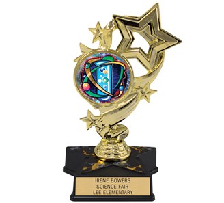 Lots of magnificent stars for your superstars! Even the base is star shaped. Choose your style trophy and any of our over 100 mylar titles. Includes an engraved plate. Order now and get a $.50 discount per item for entering engraving text online! Ships in 3 business days. Size: 4" x 7"