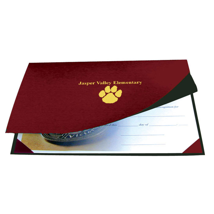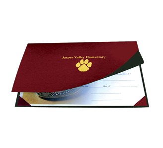 We can add your school name, city and state or school logo to this extra heavy duty folder. This lightly textured coated folder is constructed of a stiff heavyboard cover with satin corners. Each cover is designed for use with 8.5" x 11" documents either horizontally or vertically. Ship within 6 business days - first order requires one extra week for die production. Minimum order is 50 covers. Maximum imprint size is 3" x 5". Custom Die Charge of $50.00 applies to first order.