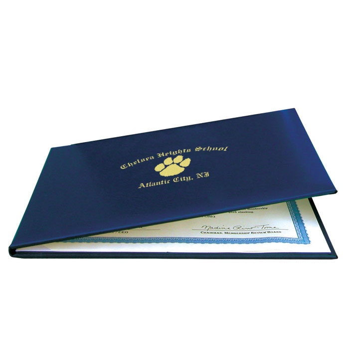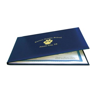 These padded diploma covers feature a lightly textured leatherette surface and your logo or wording foil stamped on the cover. This folder holds two 8.5" x 11 documents horizontally. Minimum order is 50. Imprint size is 3" x 5". A $50 die charge applies to first order. Colors may be combined for quantity discounts. Shipped within 6 business days. First order takes one extra week. If using a custom logo please remember to upload your artwork at www.jonesawards.com and reference your order number.