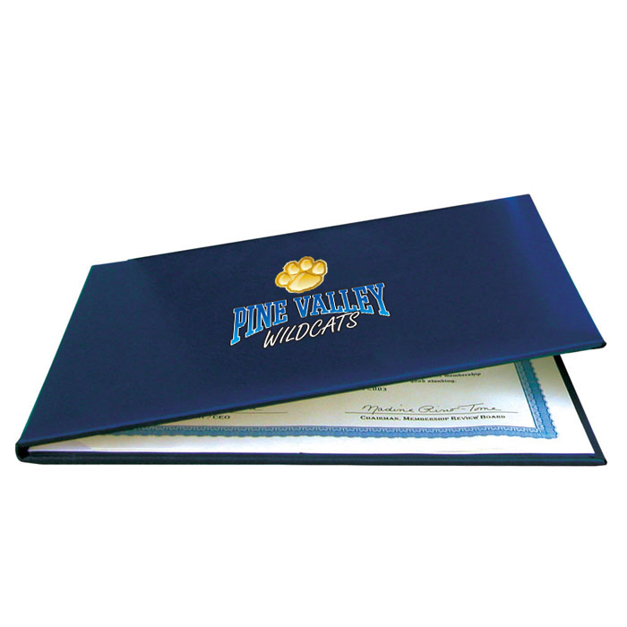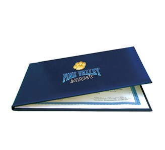 Put your school logo in full color on these classic covers. These covers are padded with a lightly textured leatherette surface. This folder is hinged on the 9" side and holds two 8.5" x 11 documents horizontally. Minimum order is 50. Imprint size is 5" x 7". Colors may be combined for quantity discounts. Shipped within 6 business days. If using a custom logo please remember to upload your artwork at www.jonesawards.com and reference your order number.